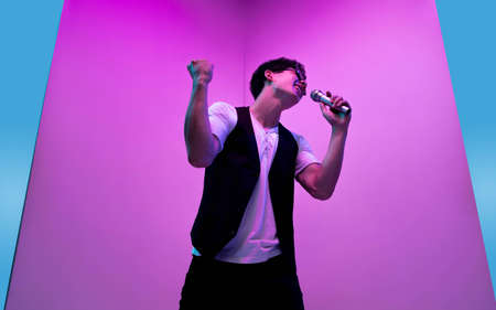 Summertime. Young male musician, singer performing on pink-blue background in neon light. Concept of music, hobby, festival, entertainment, emotions. Joyful party host, singer, portrait of artist.