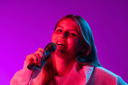 Close-up young smiling beautiful girl singing with microphone isolated on purple studio background in neon pink filter. Concept of emotions,