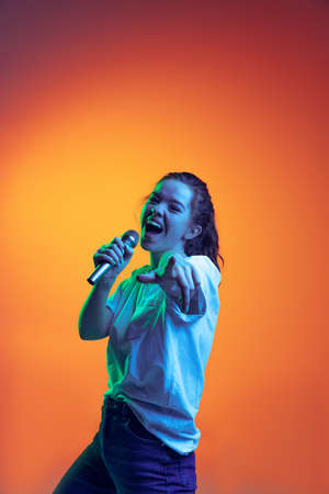 Young caucasian musician, performer singing on gradient background in neon light. Concept of music, hobby, festival. Joyful woman party host, DJ, singer, bands front artist. Colorful portrait.