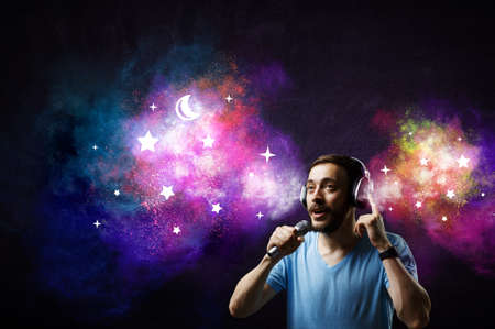 Handsome man recording a song. Focused on the microphone. Space for your text.