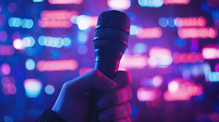 A singer holding a modern handheld microphone, with a dynamic stage background and colorful lights, capturing the energy and excitement of a live performance.
