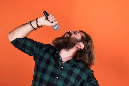 high tune. concept of karaoke. man singer love music. brutal man sing with microphone. vocal school. brutal and rock. bearded man wear checkered shirt singing song. male singer with mic