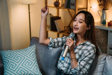 portrait happy asian girl holding a microphone is raising her hand while enjoying singing karaoke on the couch in a cozy home living room at night.