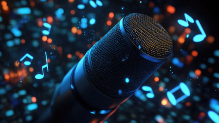 A visually striking image of a microphone surrounded by musical notes against a vibrant, colorful background. Perfect for themes of music, creativity, and performance.