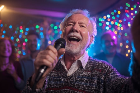 An elderly man enjoys singing on stage at a lively party in a dimly lit venue decorated with colorful lights. People cheer and dance in the background, creating a festive atmosphere.