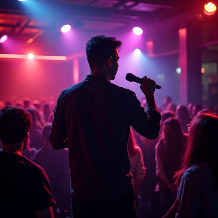 A singer in a casual outfit performing on an open mic night stage with a microphone stand