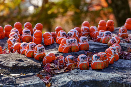 Jizo statues with red bibs and hats in okunoin cemetery, mount koya, Japan