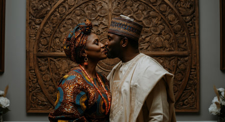 Romantic moment between african couple in traditional attire against ornate wooden carving