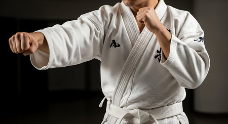 A determined figure stands poised, dressed in white gi with a black belt displaying power and focus.