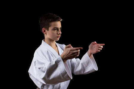 Karate martial sport with young boy in kimono and belt, black background, training.