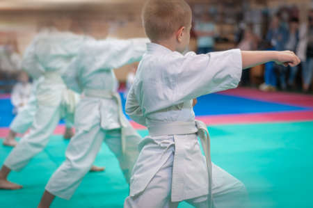 Karate training for children. Practicing a direct punch with a hand. Background photo. Added blur effect for more motion effect.