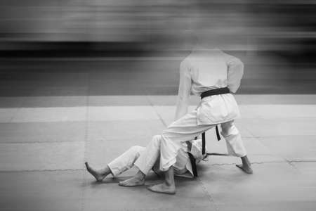Training fight in karate. Added blur effect for more motion effect. Retro style with imitation film grain. black and white.