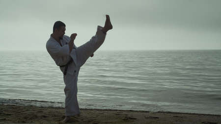 Sporty man making karate kicks on seacoast early morning close up. Serious sportsman practicing taekwondo in kimono overcast weather. Active athlete training fighting skills outdoor. Sport concept.