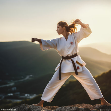 A strong woman practicing martial arts on the top of a mountain at sunset. The woman showcases her taekwondo technique with a powerful kick, embodying the beauty of martial arts in nature's embrace. Generative AI