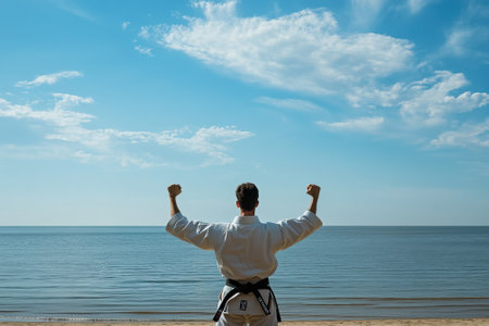 A martial artist in a white uniform stands by the calm sea, raising arms in triumph under a blue sky.