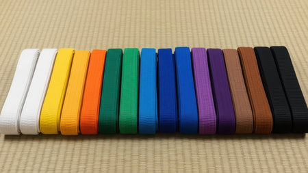 Colorful martial arts belts representing different skill levels on tatami mat.