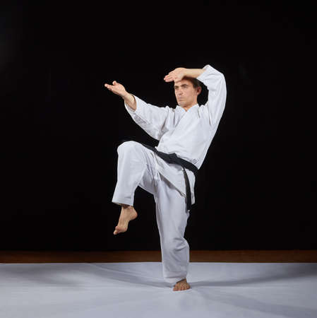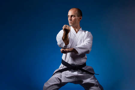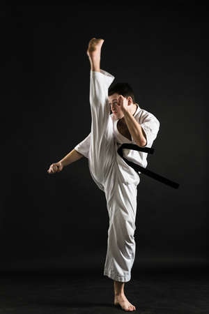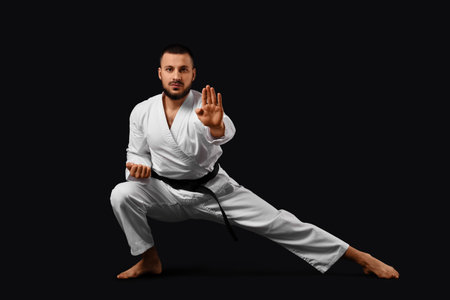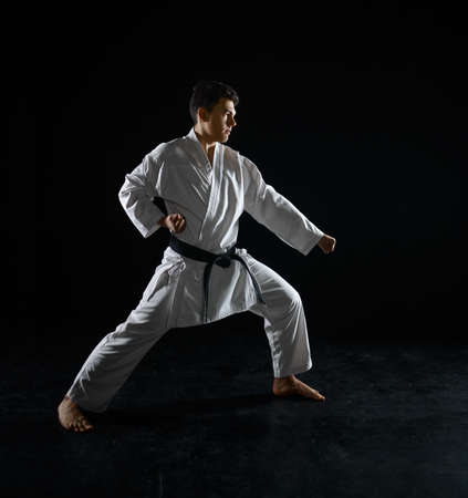 A karateka strikes or stands in a stance. Martial arts. Shidokan karate. Fighter in the studio. Kimono guy on a black background. Punch. Kick. World Karate Association the Shidokan. Black belt karate.