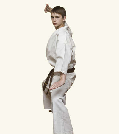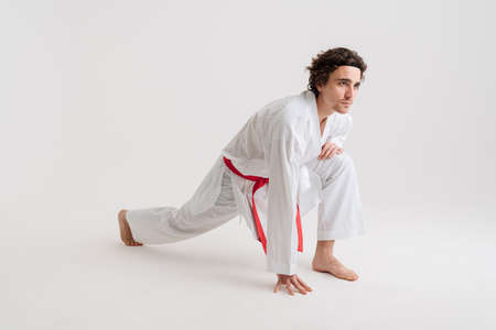 Young caucasian sportsman dressed in kimono practice in karate isolated over white background