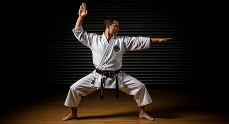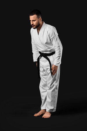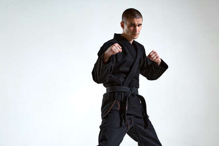 Confident man in black kimono fighter posing in karate stance on white studio background with copy space