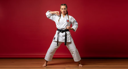 Flawless technique. A young karate professional practicing while wearing a gi.