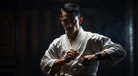 A group of martial artists in white uniforms demonstrate techniques under dramatic lighting, showcasing dedication.
