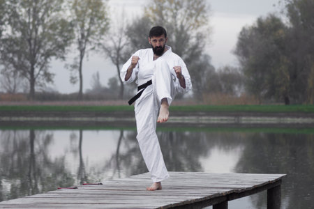 The bearded man in white kimono is practicing karate and martial arts outdoors on lakeshore in the nature.