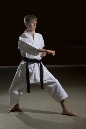 Fifteen year old male teenage karate black belt in back stance, studio shot against a black background