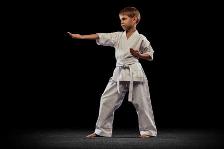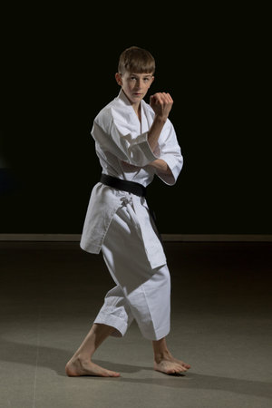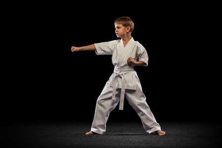 Karate martial sport with young boy in kimono and belt, black background, training.