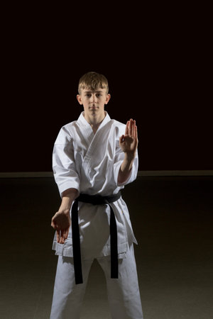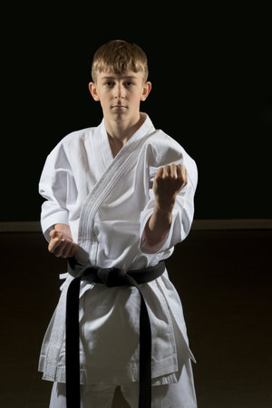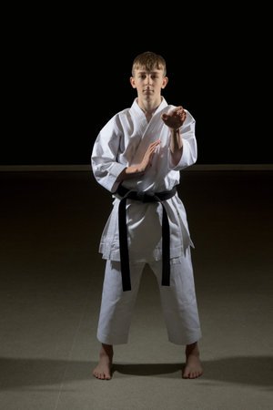 Fifteen year old male teenage karate black belt perfoming a block, studio shot against a black background