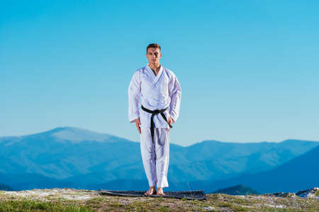Karate athlete bows down while wearing his kimono on top of a mountain.