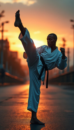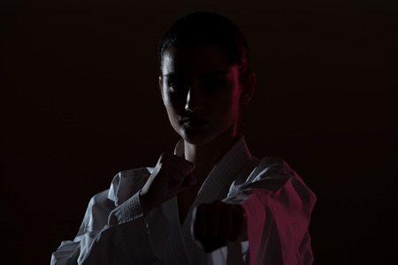 Silhouette Woman Practicing Her Karate Moves - White Kimono - Black Belt