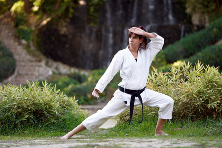 Woman in white kimono with black belt practicing karate outdoors in nature. Sports and martial arts concept.