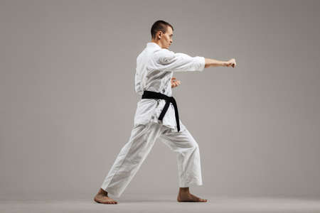 Young caucasian sportsman dressed in kimono practice in karate isolated over gray background