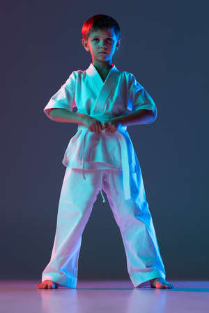 Full-length portrait of boy, karateka in white kimono posing isolated over gradient blue background in neon lights