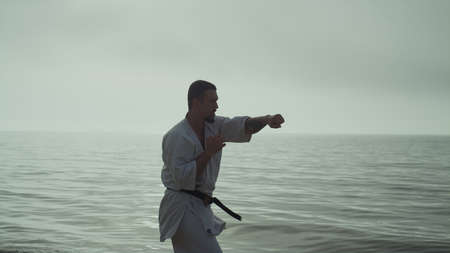 Sporty man practicing karate fighting standing beach under gray sky. Focused sportsman training martial technique cloudy morning outdoors. Bearded athlete workout wearing kimono with black belt.