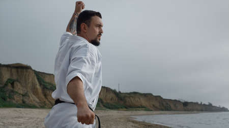Strong fighter practicing karate on sandy beach cloudy morning close up. Bearded man training combat exercises wearing kimono overcast weather. Young sportsman making dynamic hands movement outdoors.