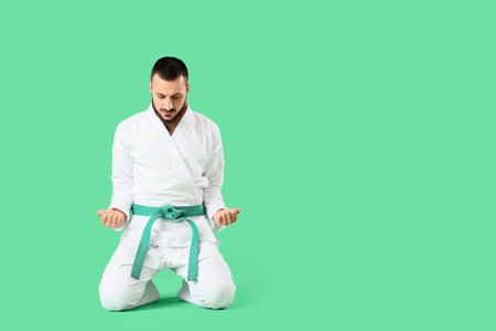 man, karate fighter or athlete, sitting in relaxing, yoga position with mudra hands, barefoot in kimono, suit, with black belt on white wall. Sport and meditation. Physical and mind training