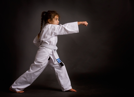 knockout. energy and activity for kids. little girl in gi sportswear. small girl in martial arts uniform. practicing Kung Fu. happy childhood. sport success in single combat. Stretching away stress