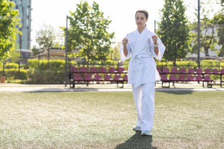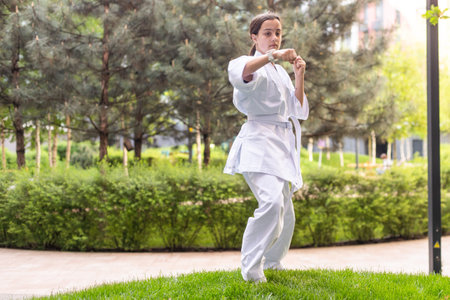 Portrait of short haired 7 years old girl in white kimono making karate kata training outdoors. Martial arts. Sport and activity for children. Japanese combat. Space for text on the right.