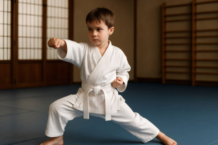 Kids training on karate-do. The karate fighter prepares to strike with his hand. Photo without faces.