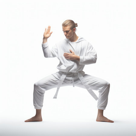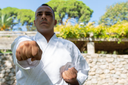 Karate man in fighting stance. Male karate fighter practices punches during karate training. Bearded man in white kimono with hands clenched in fist ready to fight. Karate man exercising combat sport.