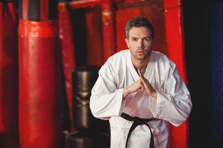 Portrait of an Caucasian professional taekwondo black belt degree (Dan) preparing for fight