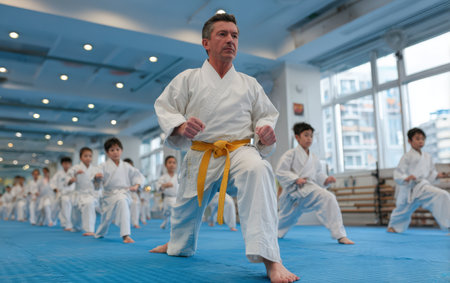 Male karate instructor demonstrates a powerful stance in a dojo, with young students practicing behind him, emphasizing dedication and teamwork in martial arts training