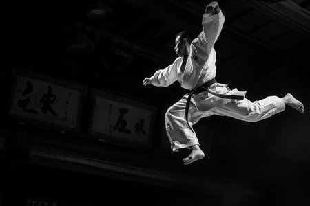 A skilled man jumps high in the air, showcasing his impressive kicking technique, A black and white action shot of a karate executor mid-jump, AI Generated