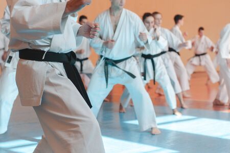 Kids training on karate-do. The karate fighter prepares to strike with his hand. Photo without faces.