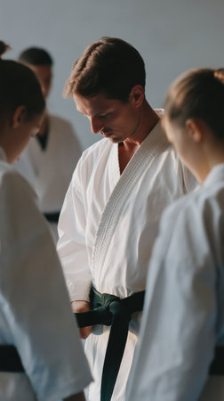 Focused sensei tying a green belt, demonstrating discipline and technique during a martial arts training session with students in a dojo, emphasizing skill development and mentorship