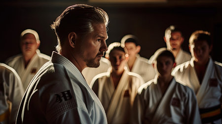 Sensei leading determined karate students rigorous training warm dojo colors authoritative presence