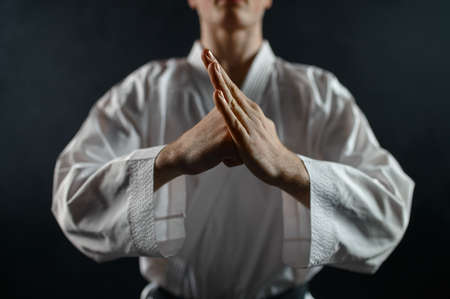 Man in white kimono and black belt training karate over dark background