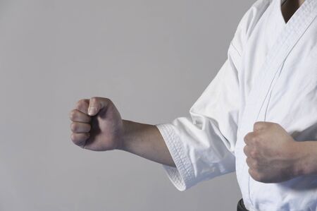 Waist of a karate master with black belt rank, posing with clenched fists as a martial arts salute before a fight
