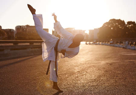 Hiiyah High kick. A young karate professional practicing while wearing a gi.